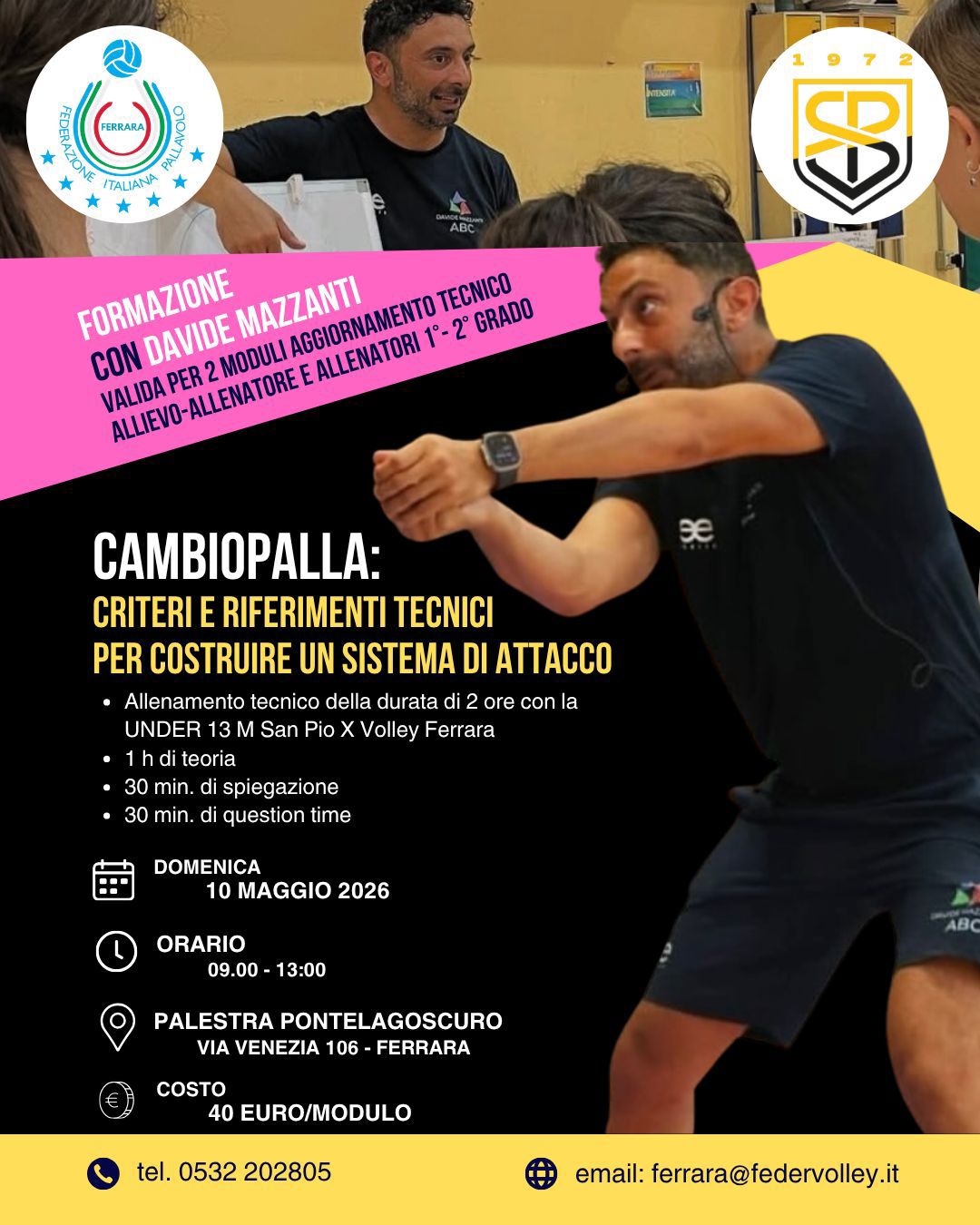 Il Comitato Fipav di Ferrara, in collaborazione con la Società San Pio X, organizza, domenica 10 maggio, un corso di aggiornamento per Allenatori di 1° e 2° Grado ed Allievi...